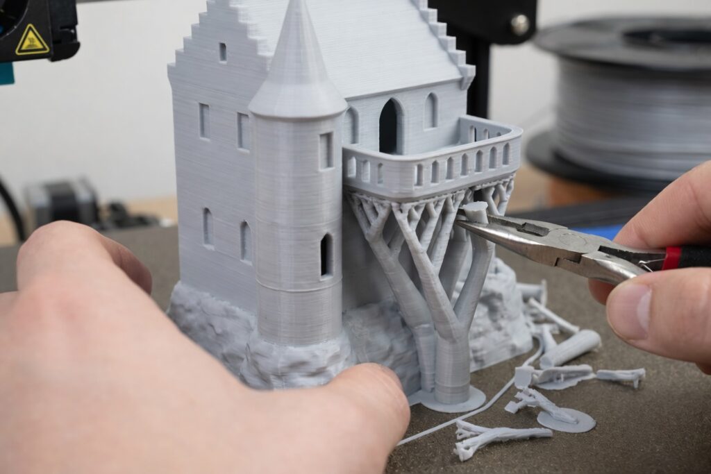 Because PLA and PETG do not chemically bond to each other, you can set the “Top Z Distance” to 0mm. The supports will literally fall off, leaving a glass-smooth bottom surface.